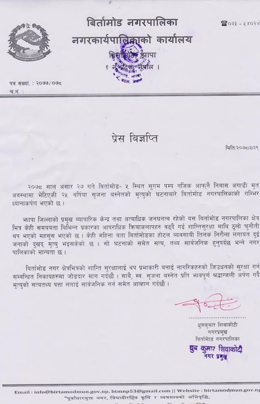 मेयर शिवाकोटीले विज्ञप्तिमा भनेका छन्, ‘बिर्तामोडमा सुरक्षा चुनौति थपिएको छ।’