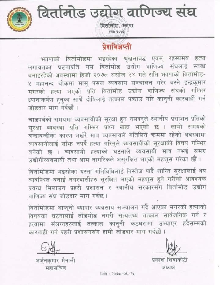संघका अध्यक्ष प्रकाश सिवाकोटी तथा महासचिव अर्जुनकुमार मैनालीले हस्ताक्षर गरेको विज्ञप्तिमा बिर्तामोडमा श्रृंखलाबद्ध हत्याकाण्ड भइरहँदा व्यवसायीले असुरक्षित हुँदै गएको जनाइएको छ।