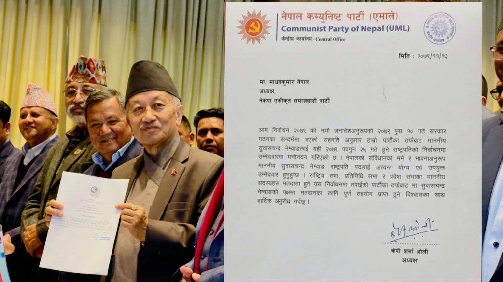काठमाडौं । नेकपा एमालेका अध्यक्ष केपी शर्मा ओलीले राष्ट्रपति पदमा सुवासचन्द्र नेम्बाङलाई समर्थन गर्न आग्रह गर्दै एकीकृत समाजवादीका अध्यक्ष माधवकुमार नेपाललाई पत्र लेखेका छन् ।