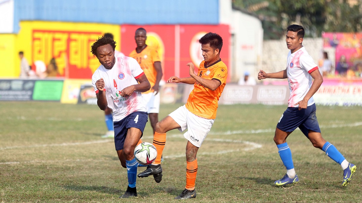पहिलो हाफको अतिरिक्त समयमा एपिएफका सविन थापाको प्रहार क्रसबारमा ठोक्किएर बाहिरियो ।
