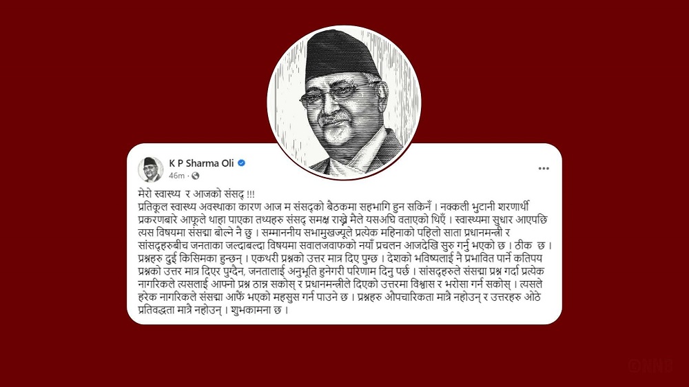 अध्यक्षओलीले सामाजिक सञ्जाल फेसबुक मार्फत प्रतिकूल स्वास्थ्य अवस्थाका कारण संसद् बैठकमा सहभागी हुन नसकेको भन्दै स्वास्थ्यमा सुधार आएलगतै नक्कली शरणार्थी प्रकरणबारे आफूले थाहा पाएका तथ्यहरू संसदमा राख्ने बताए ।