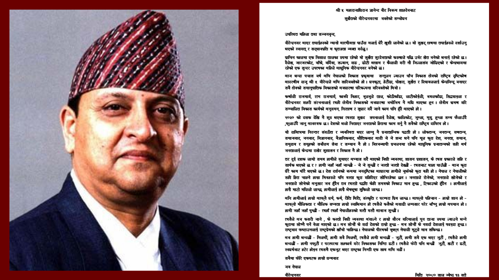 सुर्खेतको बीरेन्द्रनगरमा शनिबार आयोजित एक कार्यक्रमलाई सम्बोधन गर्दै पूर्व राजा शाहले देशको स्वाभिमानको रक्षाका लागि सबै एकजुट हुनु पर्ने अवस्था आएको बताए ।