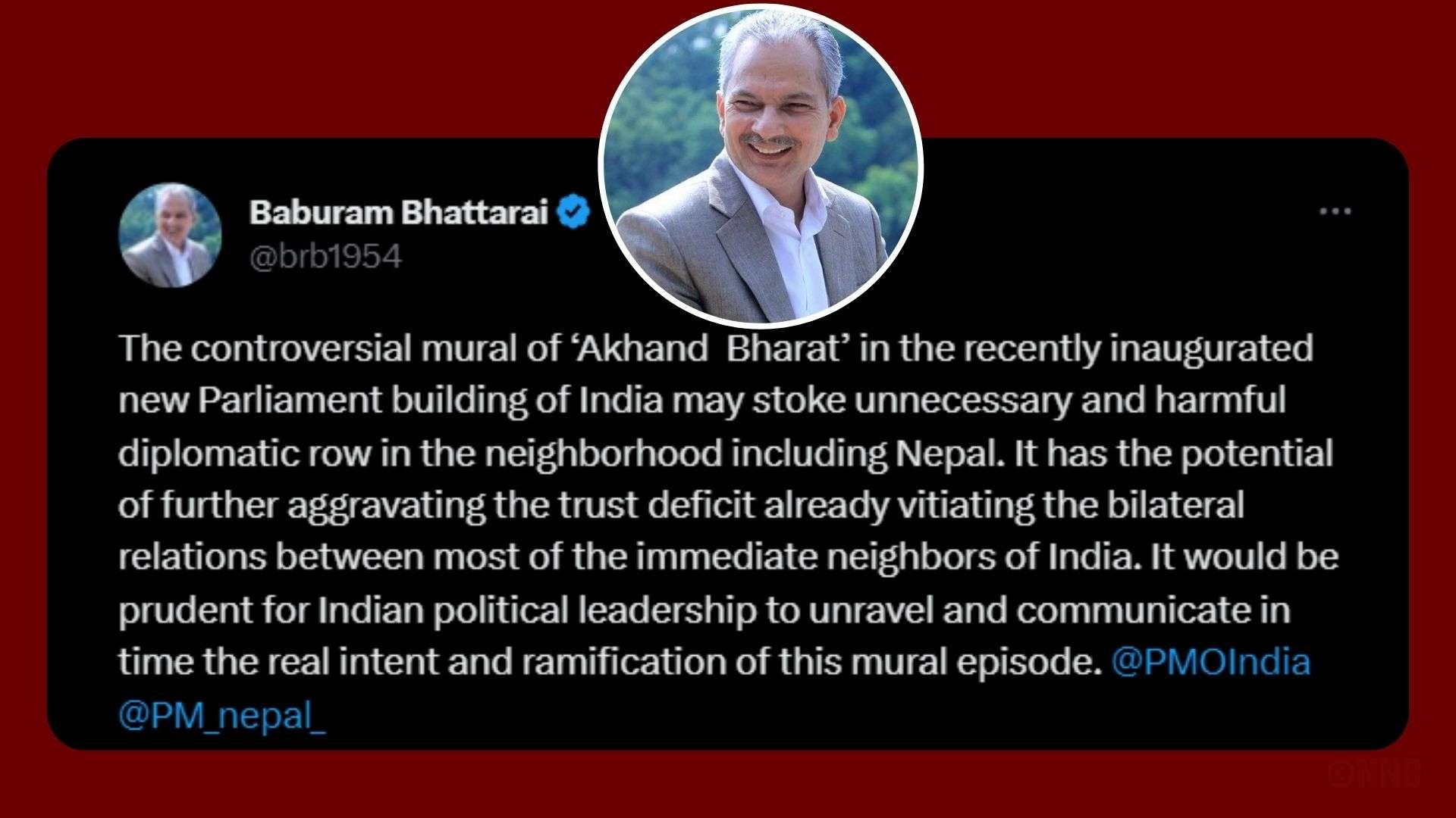 उनले सामाजिक सञ्जालमा स्टाटस् पोष्ट गर्दै भारत सरकारले भर्खरै उद्घाटन गरेको नयाँ संसद भवनमा ‘अखण्ड भारत’को विवादास्पद भित्तेचित्रले नेपाललगायत छिमेकीमा अनावश्यक र हानिकारक कूटनीतिक विवाद निम्त्याउन सक्ने उनको धारणा छ ।