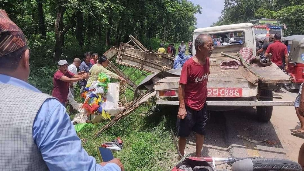 भरतपुर महानगरपालिका ९ टिकौली जङ्गल नजिक भरतपुरबाट टाँडी तर्फ जादै गरेको ना १ क ६१३१ नं.को अक्सफोर्ड कलेजको बसले विपरित दिशाबाट ना २ च ८४४६ नं.को शव बोकेर देवघाट तर्फ जादै गरेको बोलेरोलाई ठक्कर दिदाँ भएको दुर्घटनामा घाइते भएका मध्ये ७ जनाको अवस्था गम्भीर छ ।
