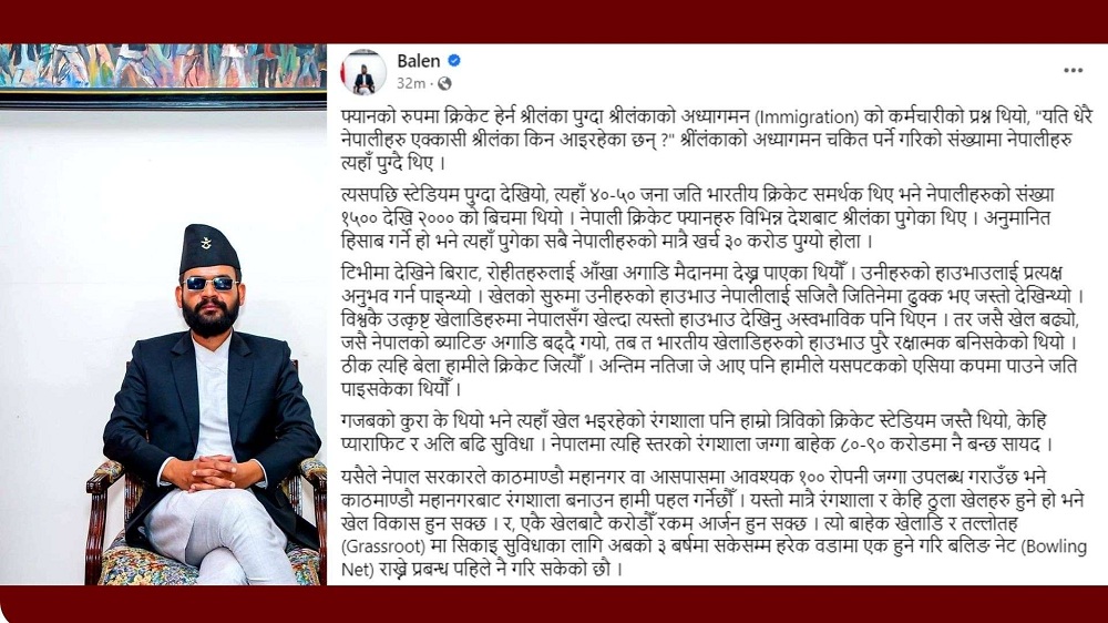 उनले लेखेका छन्, ‘नेपाल सरकारले काठमाडौं महानगर वा आसपासमा आवश्यक १०० रोपनी जग्गा उपलब्ध गराउँछ भने काठमाडौं महानगरबाट रंगशाला बनाउन हामी पहल गर्नेछौँ । यस्तो मात्रै रंगशाला र केही ठूला खेलहरू हुने हो भने खेल विकास हुन सक्छ। र, एकै खेलबाटै करोडौं रकम आर्जन हुन सक्छ । त्योबाहेक खेलाडी र तल्लो तहमा सिकाइ सुविधाका लागि अबको ३ वर्षमा सकेसम्म हरेक वडामा एक हुनेगरी बलिङ नेट राख्ने प्रबन्ध पहिले नै गरिसकेका छौँ ।’