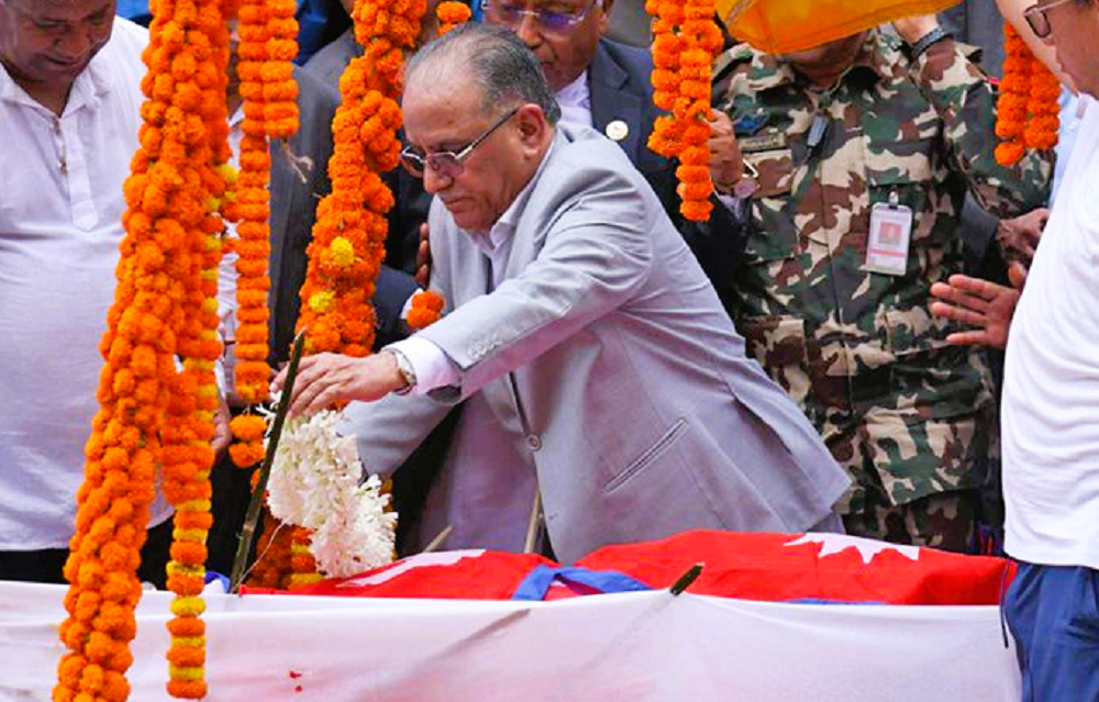 काठमाडौं । प्रधानमन्त्री पुष्पकमल दाहाल ‘प्रचण्ड’ले नेकपा एमालेका उपाध्यक्ष तथा संविधान सभाका अध्यक्ष सुवास नेम्वाङको पार्थिव शरीरमा राष्ट्रिय झण्डा ओडाएर श्रद्धाञ्जली अर्पण गरेका छन् ।