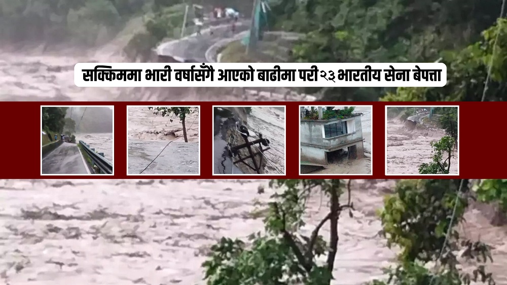 काठमाडौं । भारी वर्षापछि गएको बाढीमा परी भारतको सिक्किममा २३ भारतीय सेना बेपत्ता भएका छन् । भारतको पूर्वी उत्तरी राज्य सिक्किमको टिस्टा नदी किनारमा रहेको लिचेन भ्यालीमा एक्कासी बाढी आएको थियो ।