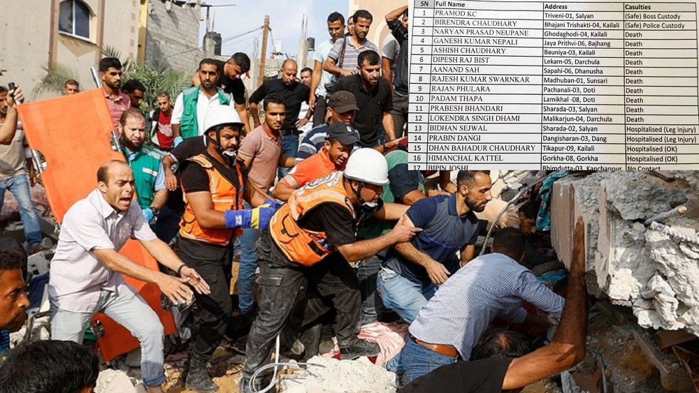 इजरायलस्थित नेपाली राजदूत कान्ता रिजालले बताएअनुसार मृत्यु हुनेमा घोडाघोडी–४ कैलालीका नारायण न्यौपाने, जयपृथ्वी–६ बझाङका गणेशकुमार नेपाली, बाउनिया–३ कैलालीका आशिष चौधरी, लेकाम–५ दार्चुलाका दिपेशराज विष्ट, सपही–६, धनुषाका आनन्द साह र मधुवान–१, सुनसरीका राजेशकुमार स्वर्णकार छन् ।