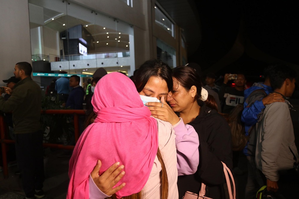 हिजो अपरान्ह उडेको जहाज शुक्रबार बिहान करिब पौने तीन बजे त्रिभुवन अन्तर्राष्ट्रिय विमानस्थल अवतरण गरेको हो । युद्धग्रस्त क्षेत्रबाट फर्किएकालाई लिन विमानस्थलमा पुगेका आफन्तको आँसुमा हर्षको आँसु देखिएको थियो । परिवारजनहरू भावविव्हल भएका थिए । उनीहरू अँगालो हालेर रोइरहेका देखिन्थे । इजरायलबाट फर्किदाको त्यो क्षणमा विमानस्थलमा सँगसँगै खुसी र आँसु देख्न सकिन्थ्यो ।