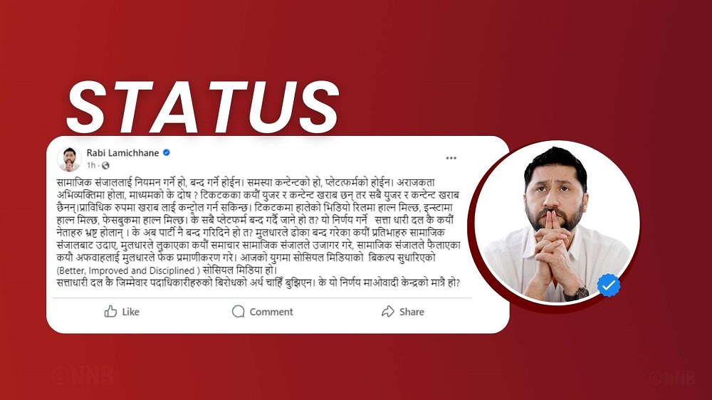 काठमाडौँ । राष्ट्रिय स्वतन्त्र पार्टीका सभापति रवि लामिछानेले सामाजिक सञ्जाललाई बन्द गर्ने नभई नियमन गर्नुपर्ने बताएका छन् ।