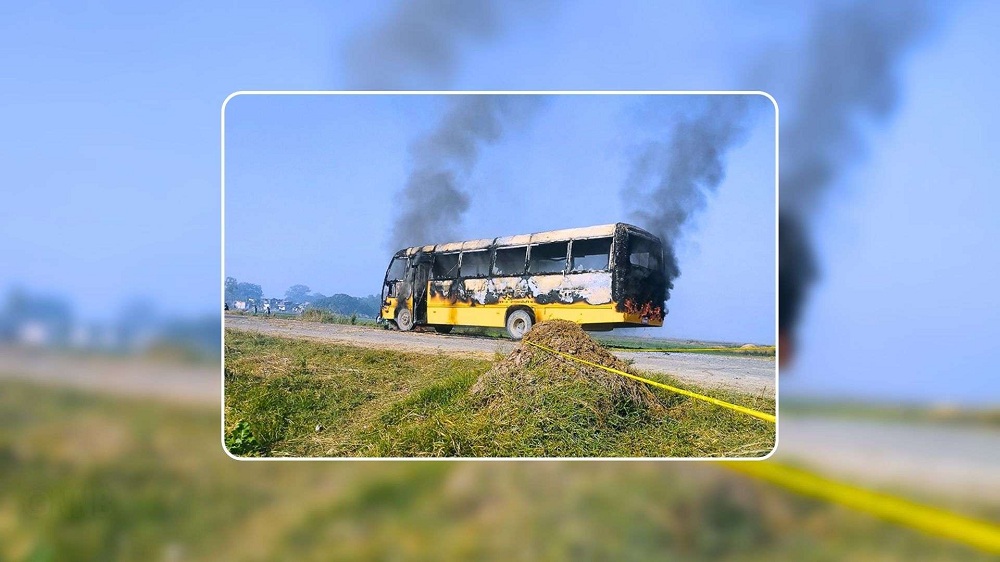 बसको ठक्करबाट मोटरसाइकलमा सवारहरुको मृत्यु भएपछि आक्रोशित स्थानीयले स्कुल बसमा आगो लगाएका छन् भने शवलाई सडकमै राखेर प्रदर्शन गरिरहेका छन् ।
