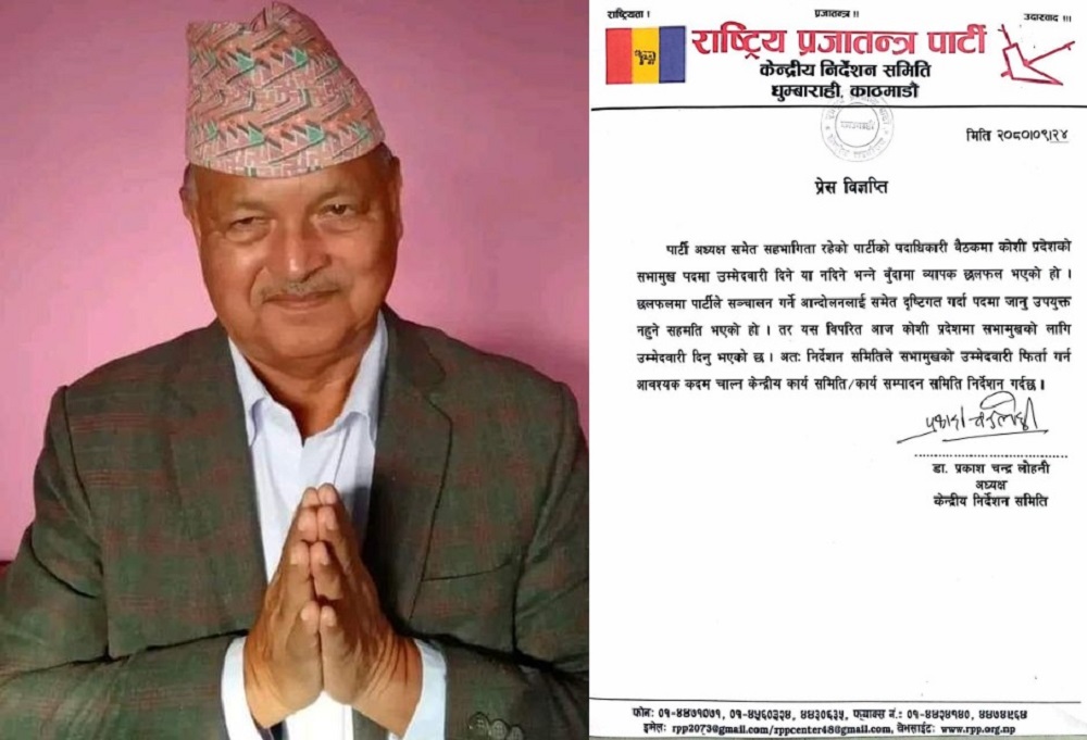 केन्द्रीय निर्देशन समितिका अध्यक्ष डा. प्रकाशचन्द्र लोहनीले जारी गरेको विज्ञप्तिमा भनिएको छ,‘पार्टी अध्यक्षसमेत सहभागिता रहेको पार्टीको पदाधिकारी बैठकमा कोशी प्रदेशको सभामुख पदमा उम्मेदवारी दिने या नदिने भन्ने बुँदामा व्यापक छलफल भएको हो । छलफलमा पार्टीले सञ्चालन गर्ने आन्दोलनलाई समेत दृष्टिगत गर्दा पदमा जानु उपयुक्त नहुने सहमति भएको हो ।’