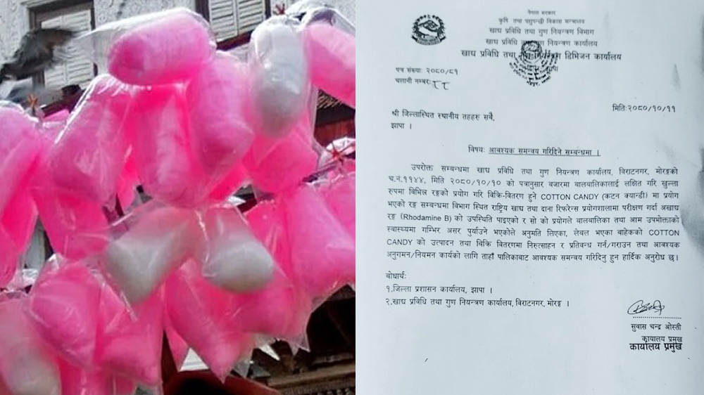बजारमा बालबालिकालाई लक्षित गरि खुल्ला रुपमा विभिन्न रङ्गको प्रयोग गरी बिक्री वितरण हुने कटन क्यान्डीमा प्रयोग भएको रङ्ग सम्बन्धमा विभागस्थित राष्ट्रिय खाद्य तथा दाना रिफरेन्स प्रयोगशालामा परीक्षण गर्दा अखाद्य रङ्ग (रोडामाइन बी) पाइएकाले त्यसको उत्पादन तथा बिक्री वितरणमा प्रतिबन्ध लगाइएको हो ।