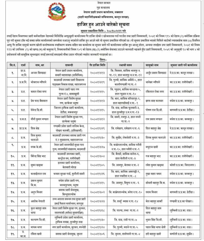 प्रहरी प्रधान कार्यालयका अनुसार शुक्रबार सूचना जारी गरी कार्यालयले दुई महिनाभन्दा बढी समयदेखि आफूखुशी गैरहाजिर रहेका नेपाल प्रहरीका विभिन्न दर्जाका प्रहरीहरूलाई एक साताभित्र स्पष्टीकरणसहित सम्पर्कमा आउन भनेको हो ।