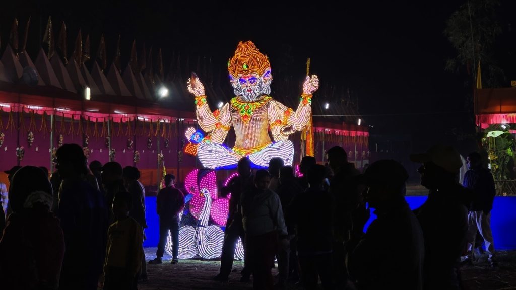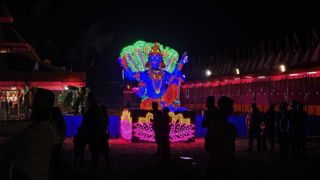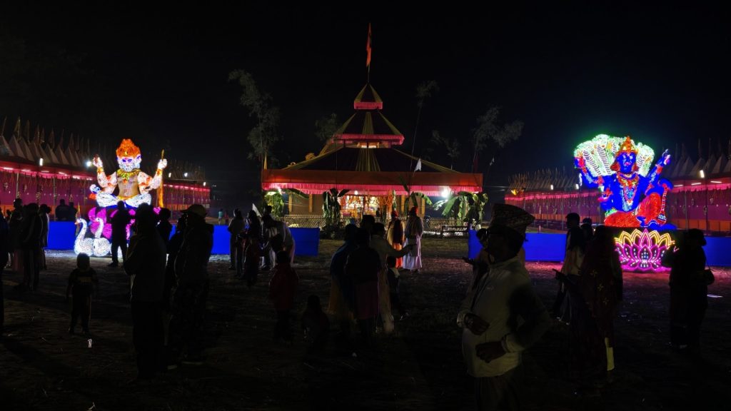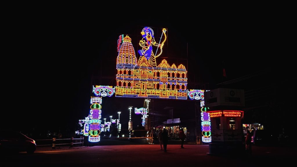 धामको ४२ औँ वार्षिक अनुष्ठानमा आयोजना गरिएको अष्टोत्तोरशत् १०८ श्रीमद् भागवत पाठ पारायण तथा हवनात्मक महायज्ञमा लगाइएको लाइटिङ सिस्टममा मानिसहरू आकर्षित भएका छन्।