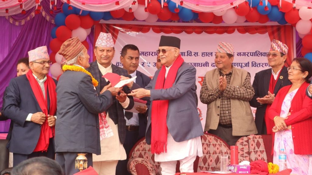गौरादह –५, स्कुलचौनस्थित शिव मन्दिर परिसरमा विशेष नापी कार्यालय झापाको आयोजनामा भूमि व्यवस्था, सहकारी तथा गरिवी निवारण मन्त्री बलराम अधिकारीको अध्यक्षतामा भएको कार्यक्रममा प्रधानमन्त्री ओलीले जग्गाधनीहरुलाई धनीपुर्जा वितरण गरेका हुन् ।