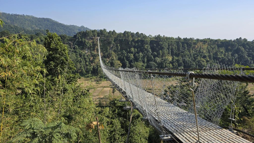 झापा- झापाको बुद्धशान्ति गाउँपालिकाका वडा नं ६ र ७ जोड्नका लागि बनिरहेको देशकै तेस्रो लामो झोलुङ्गे पुल निर्माणको काम अन्तिम चरणमा पुगेको छ।