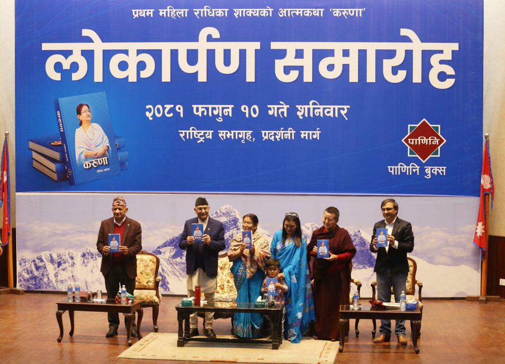 काठमाडौँ– राधिका शाक्यको आत्मकथा ‘करुणा’ लोकार्पण भएको छ। शनिवार आयोजित एक समारोहमा प्रधानमन्त्री केपी शर्मा ओलीको प्रमुख आतिथ्यमा लेखक शाक्य, नेपाल कम्युनिष्ट पार्टी (एमाले) का उपमहासचिव प्रदीप ज्ञवाली, साहित्यकार अमर न्यौपाने र गायिका आनी छोइङ डोल्माले उक्त पुस्तक लोकार्पण गरे।