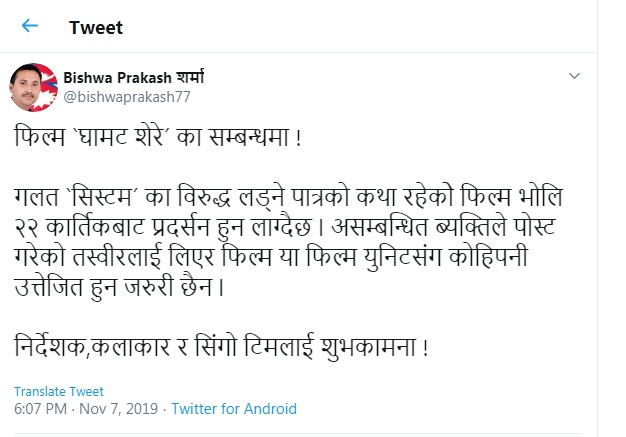 उनले सामाजिक सञ्जाल ट्विटरमा लेखेका छन्, ‘फिल्म `घामट शेरे´ का सम्बन्धमा ! गलत `सिस्टम´ का विरुद्ध लड्ने पात्रको कथा रहेकोे फिल्म भोलि २२ कार्तिकबाट प्रदर्शन हुन लाग्दैछ । असम्बन्धित ब्यक्तिले पोस्ट गरेको तस्वीरलाई लिएर फिल्म या फिल्म युनिटसंग कोही पनि उत्तेजित हुन जरुरी छैन । निर्देशक,कलाकार र सिंगो टिमलाई शुभकामना !’