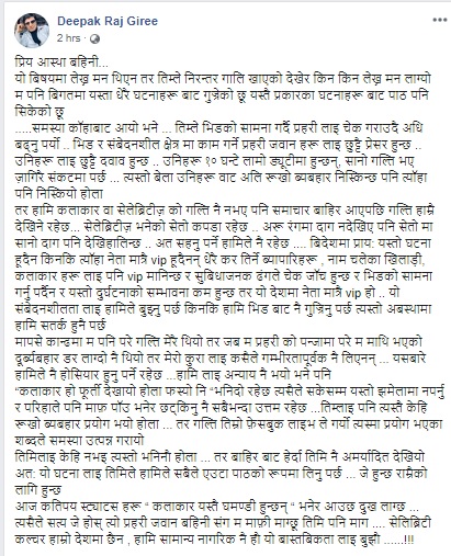 प्रिय आस्था बहिनी… यो बिषयमा लेख्न मन थिएन तर तिम्ले निरन्तर गालि खाएको देखेर किन किन लेख्न मन लाग्यो म पनि बिगतमा यस्ता धेरै घटनाहरू बाट गुज्रेको छू यस्तै प्रकारका घटनाहरू बाट पाठ पनि सिकेको छू …..समस्या कॉहाबाट आयो भने … तिम्ले भिडको सामना गर्दै प्रहरी लाइ चेक गराउदै अधि बढ्नु पर्यो .. भिड र संबेदनशील क्षेत्र मा काम गर्ने प्रहरी जवान हरू लाइ छुट्टै प्रेसर हुन्छ .. उनिहरू लाइ छुट्टै दवाव हुन्छ .. उनिहरू १० घन्टे लामो ड्यूटीमा हुन्छन्, सानो गल्ति भए ज़ागिरै संकटमा पर्छ … त्यस्तो बेला उनिहरू वाट अलि रूखो ब्यबहार निस्किन्छ पनि त्यॉहा पनि निस्कियो होला तर हामि कलाकार वा सेलेब्रिटीज़ को गल्ति नै नभए पनि समाचार बाहिर आएपछि गल्ति हाम्रै देखिने रहेछ… सेलेब्रिटीज़ भनेको सेतो कपडा रहेछ .. अरू रंगमा दाग नदेखिए पनि सेतो मा सानो दाग पनि देखिहालिन्छ .. अत सहनु पर्ने हामिले नै रहेछ …. बिदेशमा प्राय: यस्तो घटना हूदैन किनकि त्यॉहा नेता मात्रै vip हूदैनन् धेरै कर तिर्ने ब्यापारिहरू , नाम चलेका खिलाड़ी, कलाकार हरू लाइ पनि vip मानिन्छ र सुबिधाजनक ढंगले चेक जॉच हुन्छ र भिडको सामना गर्नु पर्दैन र यस्तो दुर्घटनाको सम्भावना कम हुन्छ तर यो देशमा नेता मात्रै vip हो .. यो संबेदनशीलता लाइ हामिले बुझ्नु पर्छ किनकि हामि भिड बाट नै गुज्रिनु पर्छ त्यस्तो अबस्थामा हामि सतर्क हुनै पर्छ मापसे कान्ढमा म पनि परे गल्ति मेरै थियो तर जब म प्रहरी को पन्जामा परे म माथि भएको दूर्ब्यबहार डर लाग्दो नै थियो तर मेरो कुरा लाइ कसैले गम्भीरतापूर्वक नै लिएनन् … यसबारे हामिले नै होसियार हुनु पर्ने रहेछ …हामि लाइ अन्याय नै भयो भने पनि “कलाकार हो फूर्ती देखायो होला फस्यो नि “भनिदो रहेछ त्यसैले सकेसम्म यस्तो झमेलामा नपर्नु र परिहाले पनि माफ़ पॉउ भनेर छट्किनु नै सबैभन्दा उत्तम रहेछ …तिम्लाइ पनि त्यस्तै केहि रूखो ब्यबहार प्रयोग भयो होला … तर गल्ति तिम्रो फ़ेसबुक लाइभ ले गर्यो त्यस्मा प्रयोग भएका शब्दले समस्या उत्पन्न गरायो तिमिलाइ केहि नभइ त्यस्तो भनिनौ होला … तर बाहिर बाट हेर्दा तिमि नै अमर्यादित देखियो अत: यो घटना लाइ तिमिले हामिले सबैले एउटा पाठको रूपमा लिनु पर्छ … जे हुन्छ राम्रैको लागि हुन्छ आज कतिपय स्ट्याटस हरू “ कलाकार यस्तै घमण्डी हुन्छन् “ भनेर आउछ दुख लाग्छ … त्यसैले सत्य जे होस् त्यो प्रहरी जवान बहिनी संग म माफ़ी माग्छू तिमि पनि माग …. सेलिब्रिटी कल्चर हाम्रो देशमा छैन , हामि सामान्य नागरिक नै हौ यो बास्तबिकता लाइ बुझौ ……!!!